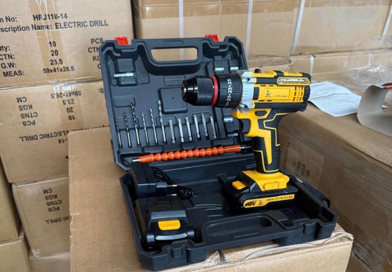 آلة براغي وشحن كهربائية احترافية، محمولة وخفيفة الوزن. تأتي داخل علبة عملية تحتوي على: