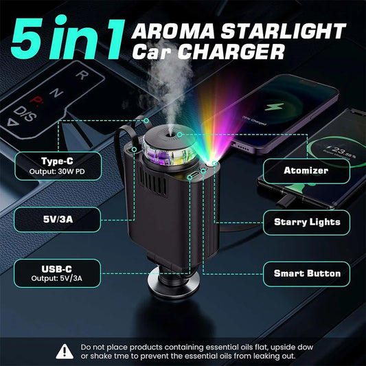 Chargeur de Voiture 5-en-1 Starlight Rétractable Diffuseur d’Arôme Intégré