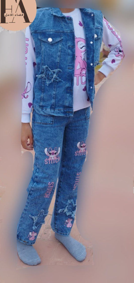 • أنصومبل نجيمات دجين بنات 3ps جلي و قبية و سروال دجين  بطبعة ستيتش   توب قبي