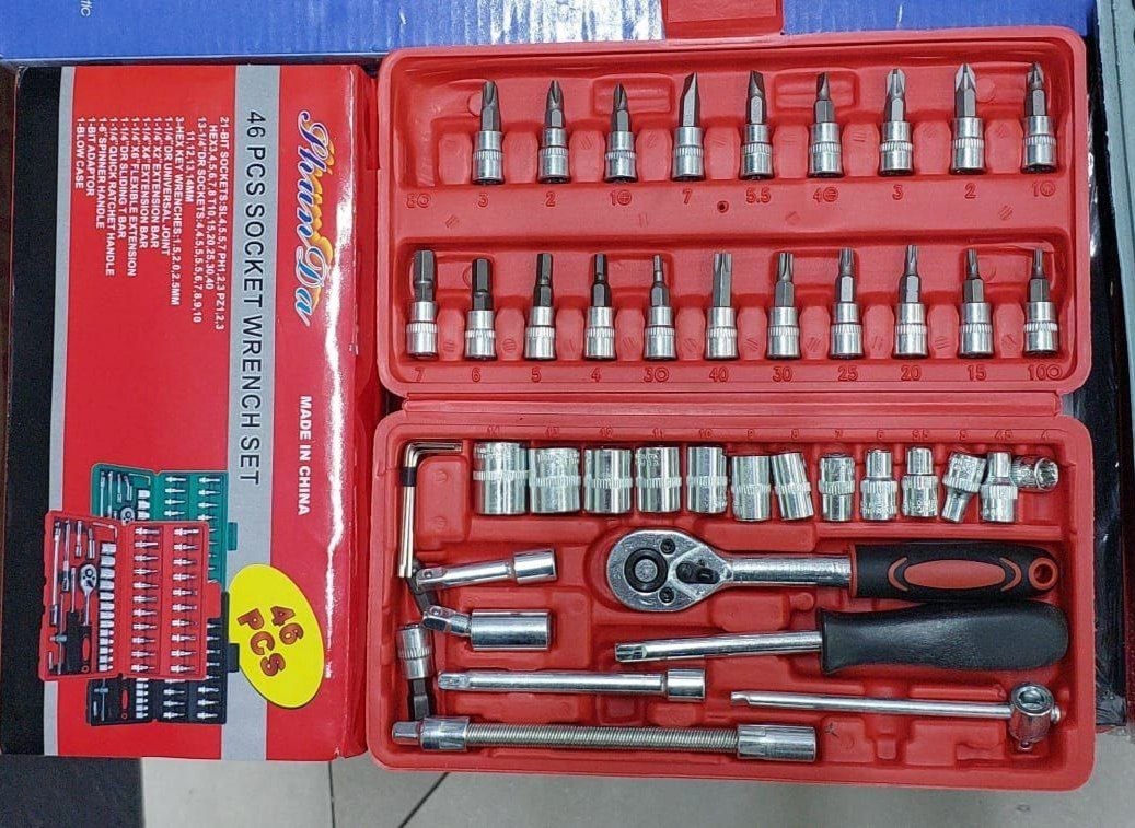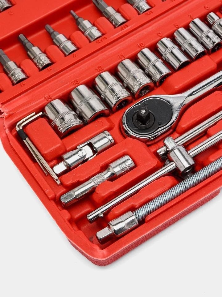 | وصف المنتج : مجموعة أدوات يدوية مكونة من 46 قطعة، مجموعة مقابس، مفتاح ربط سريع الفك، مجموعة مفاتيح ربط مركبة Kit d'outils à main 46 pièces,jeu de douilles,clé à cliquet rapide, Ensemble de clés à douille combinées,boîte à outils pour voiture, vélo |
