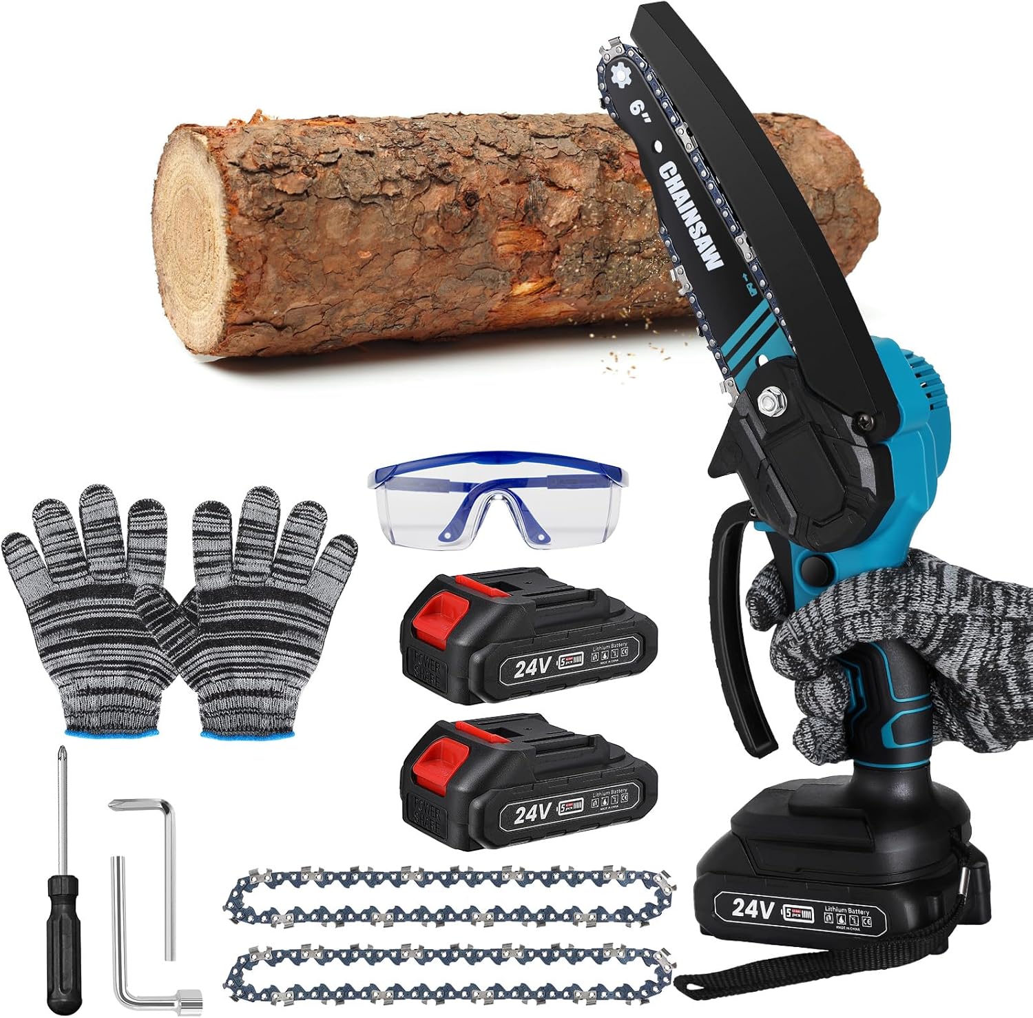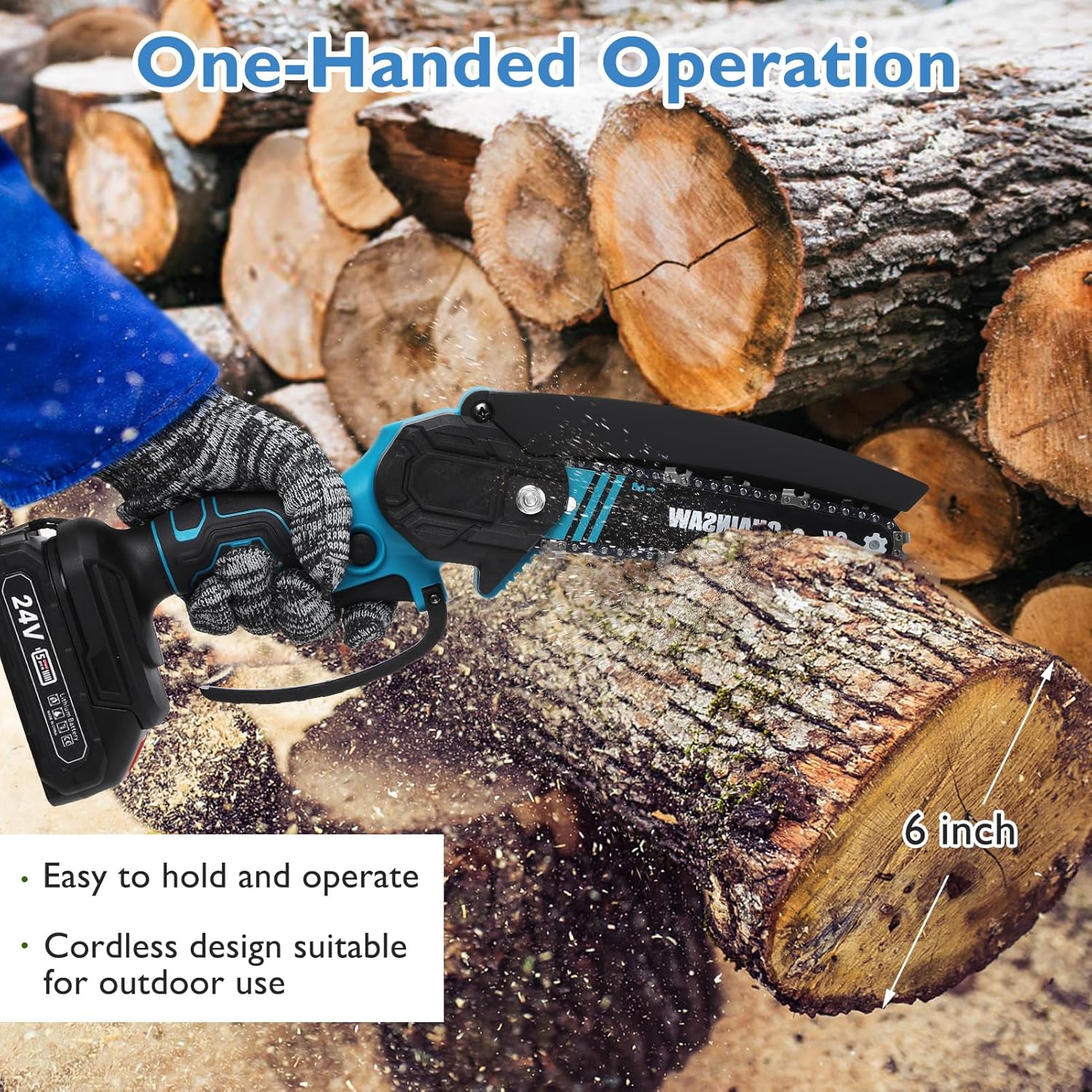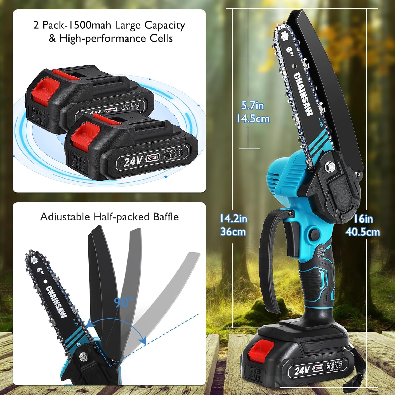 800W Mini Tronconneuse a Batterie 6 Pouces, Tronconneuse Electrique Sans Fil Tronconneuse Thermique à Une Main Portable avec 2 Batteries 1.5Ah 2 Chaînes Pour Jardin La Cour L'élagage Branches.