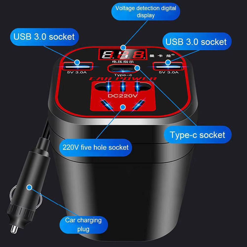 Onduleur/convertisseur de voiture qui transforme le courant continu (CC) de 12V/24V de la batterie du véhicule en courant alternatif (CA) de 220V, permettant d'alimenter des appareils électroniques.